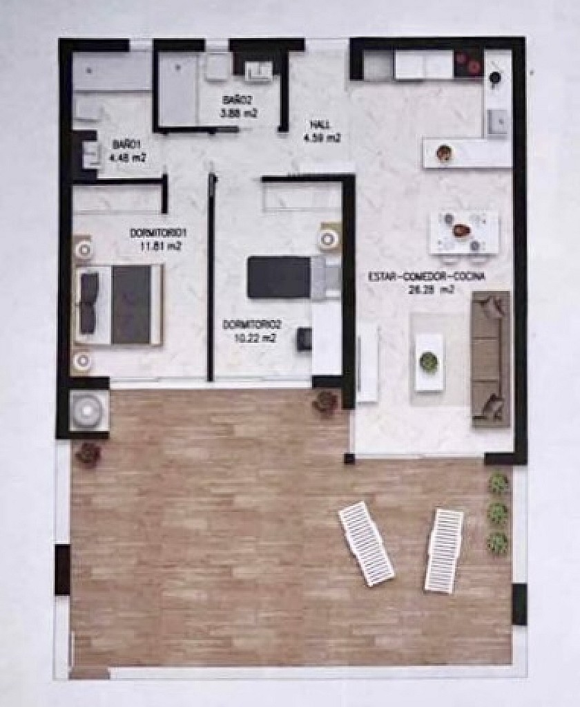 Lägenheten, som är nästintill ny och byggd med högkvalitativa material, erbjuder en elegant design med öppna ytor och härligt ljusinsläpp. Den består av två rymliga sovrum, två moderna badrum (varav ett en-suite), ett ljust vardagsrum med öppen planlösning, ett fullt utrustat kök samt en stor privat terrass perfekt för soliga dagar året runt.